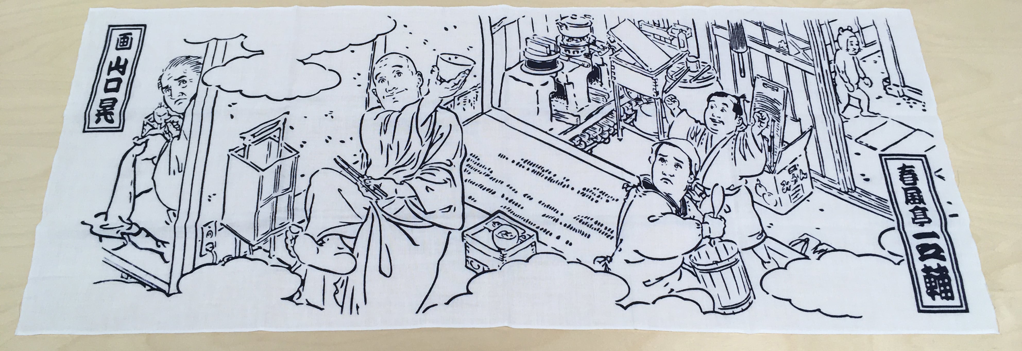 若手落語家・春風亭一之輔師匠&山口晃が案内する落語入門書第二弾『春風亭一之輔のおもしろ落語入門 おかわり!』の表紙画をあしらった手ぬぐいです。